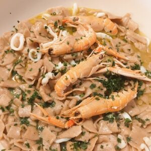 vino molto persistente da consumare con piatti di pesce, il crudo sicuramente ma lo vedo prevaricante, mentre su primi e secondi fino ad arrivare a zuppe di pesce: io l’ho provato su questo maltagliato in brodetto di scampi, una figata.