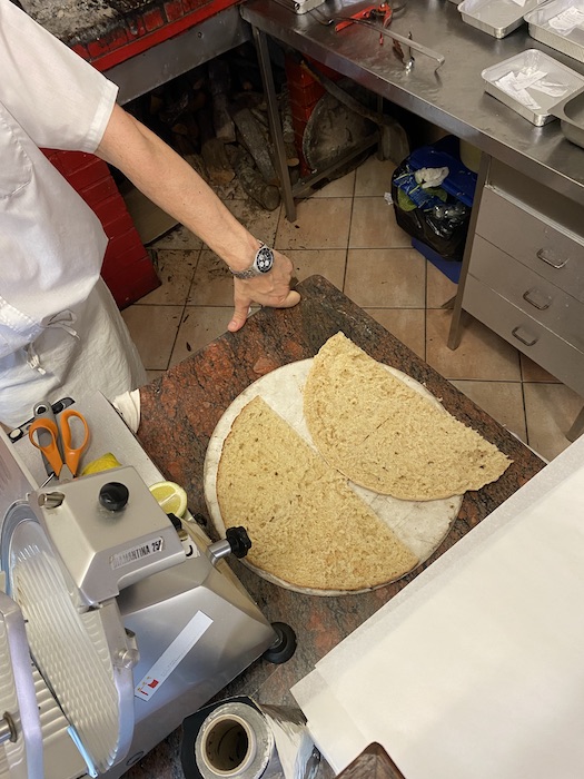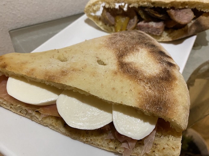 Per completare il tutto, la mitica Torta al Testo. Una focaccia bianca, preparata con farina 00, integrale e semola, lievitata con lievito classico. Un impasto semplice ma antico, cotto come si faceva una volta: su un “testo”, una teglia poggiata sul fuoco vivo, coperta da un coperchio colmo di brace. È così che si cucinava nelle campagne umbre e non solo, quando il forno era un lusso.