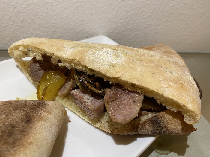 Io l’ho farcita con salsicce ben unte del succo di pollo e accompagnata da patatine sfogliate, croccanti come chips, ma mille volte più saporite.
