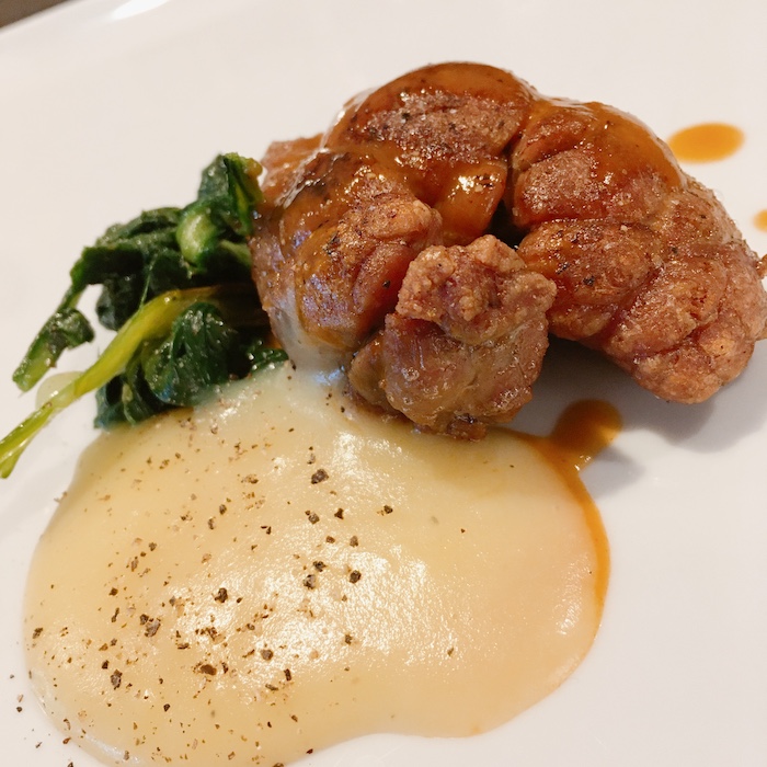Ormai sfinito ma soddisfatto ho dovuto assecondare la voglia dello chef con tre piatti imperdibili come il maiale brasato con salsa di soia e mostarda, l’animella su crema di patata e la guancia di vitello brasata al Primitivo, ma giuro che sono serviti solo per finire il cestino di pane fragrante fatto dallo chef.