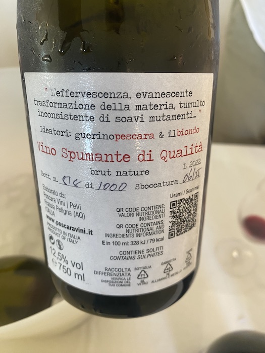 sorpresa delle sorprese. In giro per vini incontro Guerino Pescara un ragazzone capace e caparbio come tanti in Abruzzo. Enologo e agronomo ma soprattutto bravo. Tante esperienze prima di cimentarsi con i suoi vini che ho trovato già abbastanza centrati nello stile ed elemento più importante rispecchiano il gusto del territorio: freschi, sapidi ed in equilibrio con il frutto.