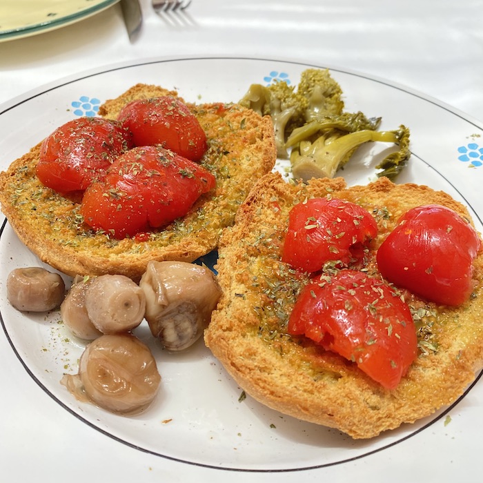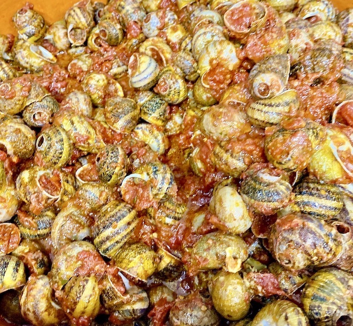 Una bruschetta generosa con olio di Coratina, le lumache al pomodoro (i mitici ciammaruchi), contorno di friggitelli. e la zuppetta di cozze al pomodoro. E il Parchitello nel calice. Così sì, che si vive.