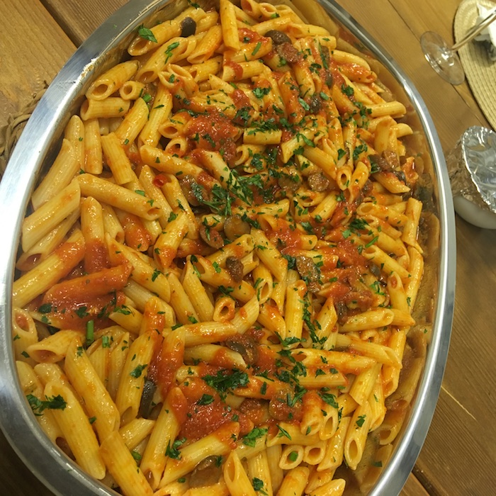 Lo ammetto, la cucina di mamma Maria ha monopolizzato tutta la mia attenzione, ma non si può non parlare delle pennette all’arrabbiata condite con ingredienti prodotti dietro casa, come le olive nere in salamoia e il peperoncino fresco.