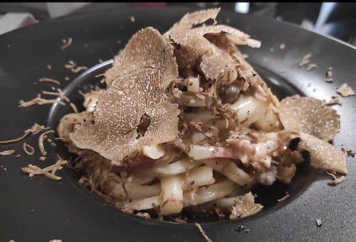 Di ottima fattura sono i “pizzicuni” ( pasta acqua e farina lavorata a mano lunga e spessa) tipico piatto della cucina di Colli di Montebove composto da un condimento povero di salsiccia, guanciale e pecorino con l’immancabile tartufo bianco dei monti carseolani da un’idea dello chef Thomas (giovane collaboratore e braccio destro di Elisa) e i maccaronaccio al pomodoro: un piatto dove usare il bavaglio è d’obbligo.