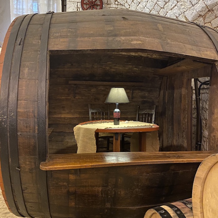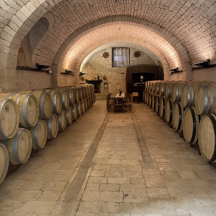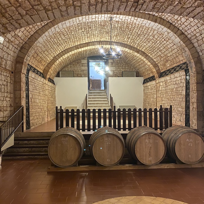 All’ingresso sono atteso da una sua collaboratrice, ineccepibile in ogni senso, poi inizio a fare un giro con Giovanni, e ad ogni passo i miei occhi si riempiono di stupore. Ambienti enormi tutti in pietra con volte a vela. E tante botti adattate a mo’ di tavoli per la degustazione.