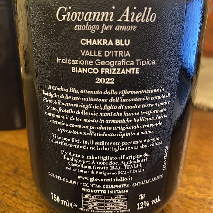 Le danze si aprono con il Chakra blu 2022, un rifermentato in bottiglia ancestrale, con 14/15 mesi sui lieviti non sboccato e Pas dosè.