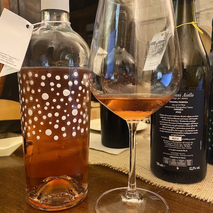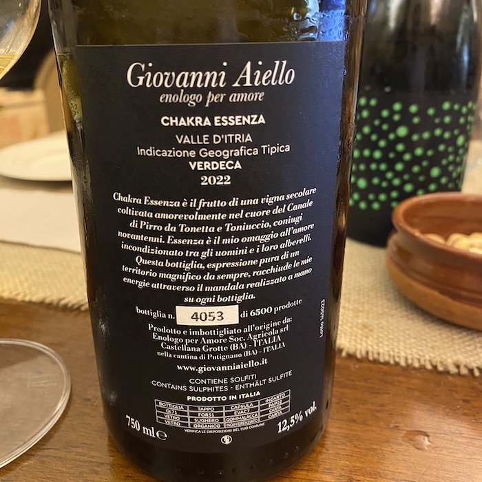 E poi il Chakra Essenza 2022, poesia pura nel bicchiere, un vino che affascina, coinvolge e convince. Ha una lavorazione particolare, che vi consiglio di farvi spiegare da Giovanni. Sempre da Verdeca in purezza ma da un vitigno ad alberello sempre in Valle d’Itria, zona Alberobello, condotto ancora da una due “giovani anziani”, i coniugi Tonetta e Toniuccio. Notevoli sono i profumi grazie alla breve macerazione del mosto con una parte di bucce: il resto è un segreto… ahah…