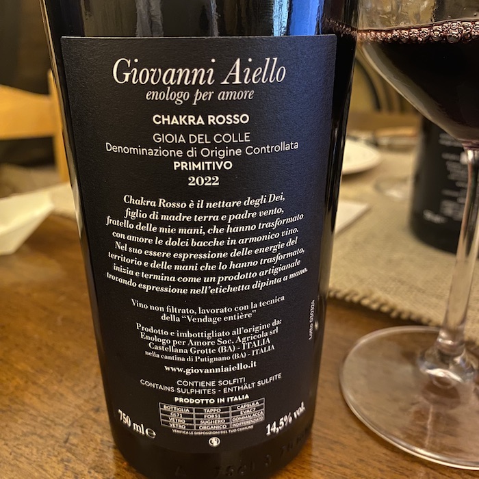 E ora parliamo di Primitivo: il Chakra 2022. No. Non avete capito. Non quello cremoso, zuccheroso, spalmabile che sa di marmellata. Questo Primitivo prodotto in zona Acquaviva, non è cremoso, e sprigiona toni speziati e floreali. Dal sapore fresco, ricco di frutto e tanta bevibilità. Con tannini ben integrati grazie ad una lavorazione artigianale.