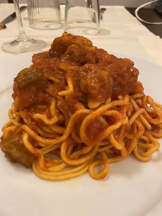 Ma il piatto che più mi ha colpito – e che ho ordinato nei giorni successivi – è stata un’insalata di ceci di Navelli. Semplice, leggera, gustosa. Navelli, lo ricordo, è anche terra di zafferano. In quel piatto c’era tutto: la cultura contadina, la valorizzazione del territorio, un equilibrio nutrizionale raro da trovare in trattoria. Un piatto povero, forse, ma straordinariamente ricco.