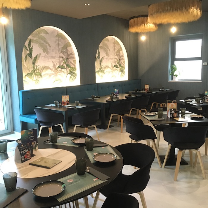 Ambienti e arredi moderni su tonalità verde rilassante, tutto curato nei dettagli dalla tovaglietta al tovagliolo porta posate e il bicchiere per l’acqua.