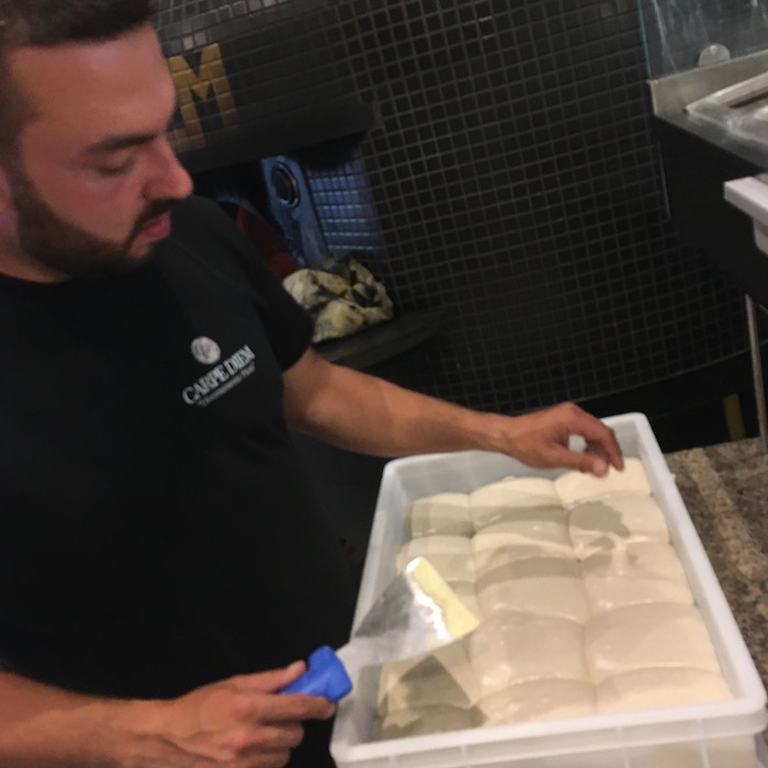 Al mio arrivo stavano impastando e mi mostra l’elasticità dell’impasto e assieme prepariamo una classica Margherita con mozzarella di Bufala di un caseificio di Caserta, cottura breve a 380 gradi e la pizza è pronta, filo d’olio di Coratina e che ve lo dico affare, una tonda che si mangia con facilità, leggerissima e molto digeribile.