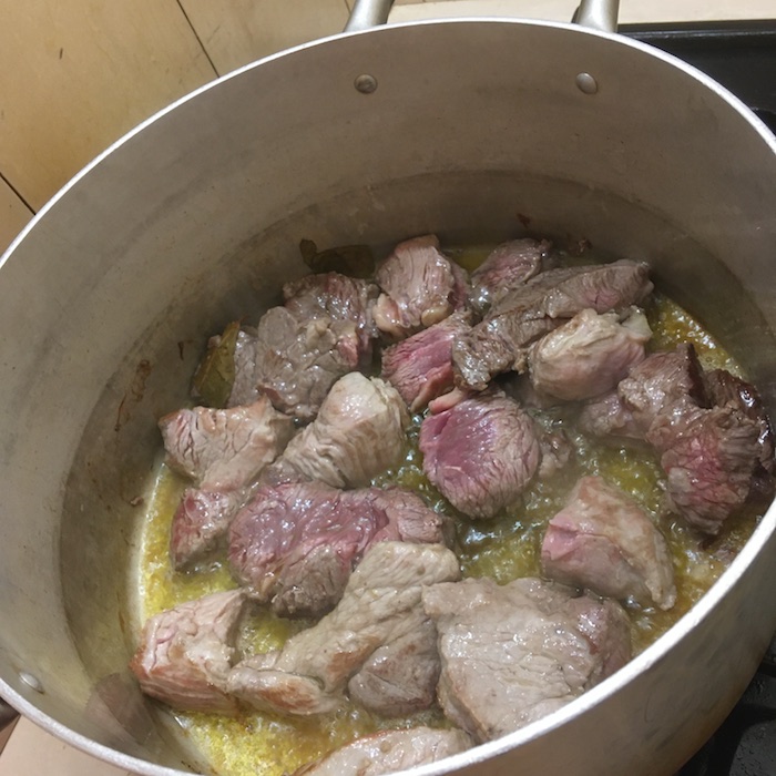 - Mettere l’olio nella casseruola alta in modo da far rosolare bene la carne, facendone lasciare il sapore sfumando con poco vino bianco.