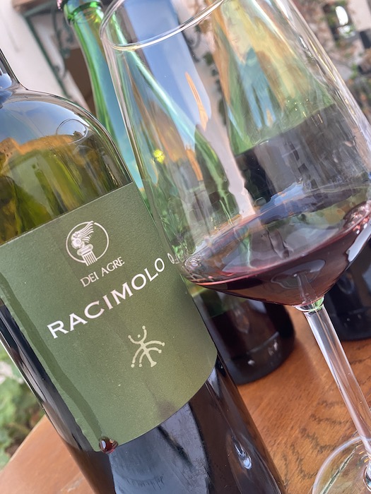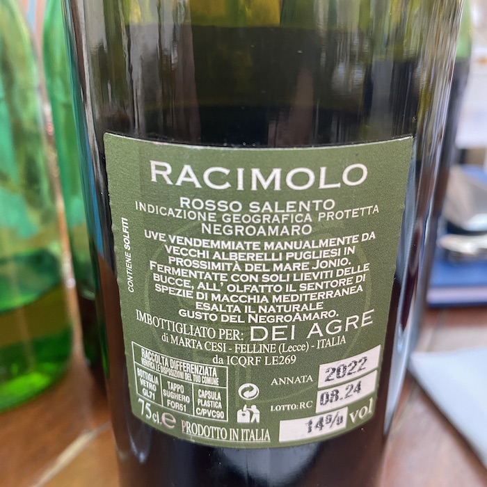 Poi è il momento del Racimolo, da uve Negroamaro: lavorato solo in acciaio, è un vino diretto, fruttato, con le classiche note balsamiche. Al sorso, emerge tutta la personalità del Negroamaro di Marta: spezia nera, acidità ben presente, tannini decisi e un finale che sa di macchia mediterranea e salsedine.