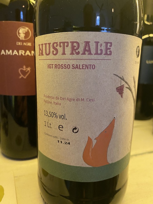 La tecnica del vino “Nustrale” è semplice e radicata: dopo la raccolta delle uve destinate ai mosti fiore di qualità (Magredè, Racimolo e Lunatico), le vinacce vengono pressate, e il mosto residuo fermenta spontaneamente. Il risultato finisce nelle bottiglie da litro, pronte per il consumo quotidiano. A vendemmia finita, si unisce tutto: Negroamaro e Malvasia Nera.