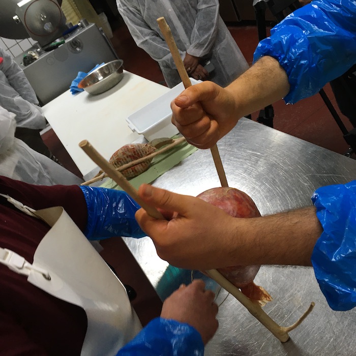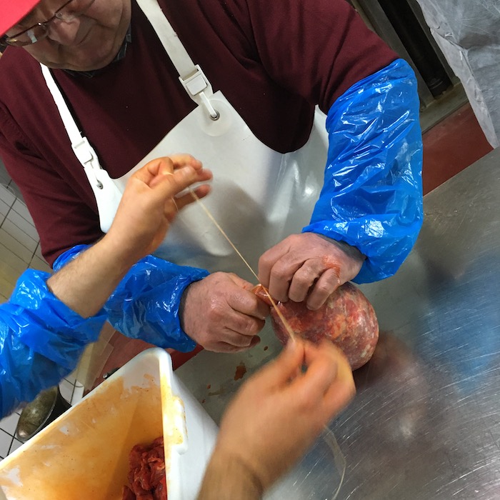 Insomma, tagliati i pezzi e conditi con la ricetta segreta di Luciano, si passa ad insaccarla nella vescica del maiale, oggi sostituita da un budello naturale molto simile. Legata e stretta nel classico legno a forcella che serviva per appenderla nelle cantine.