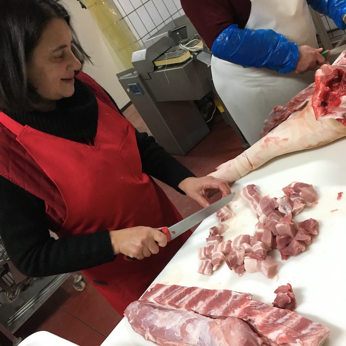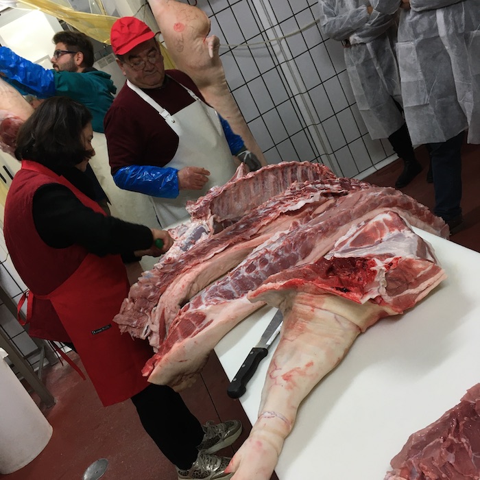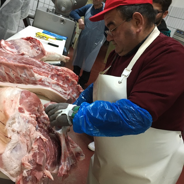 Luciano è un macellaio esperto e in pochi minuti disossa una mezzena di maiale ricavandone i vari pezzi nobili per la preparazione della Ventricina.